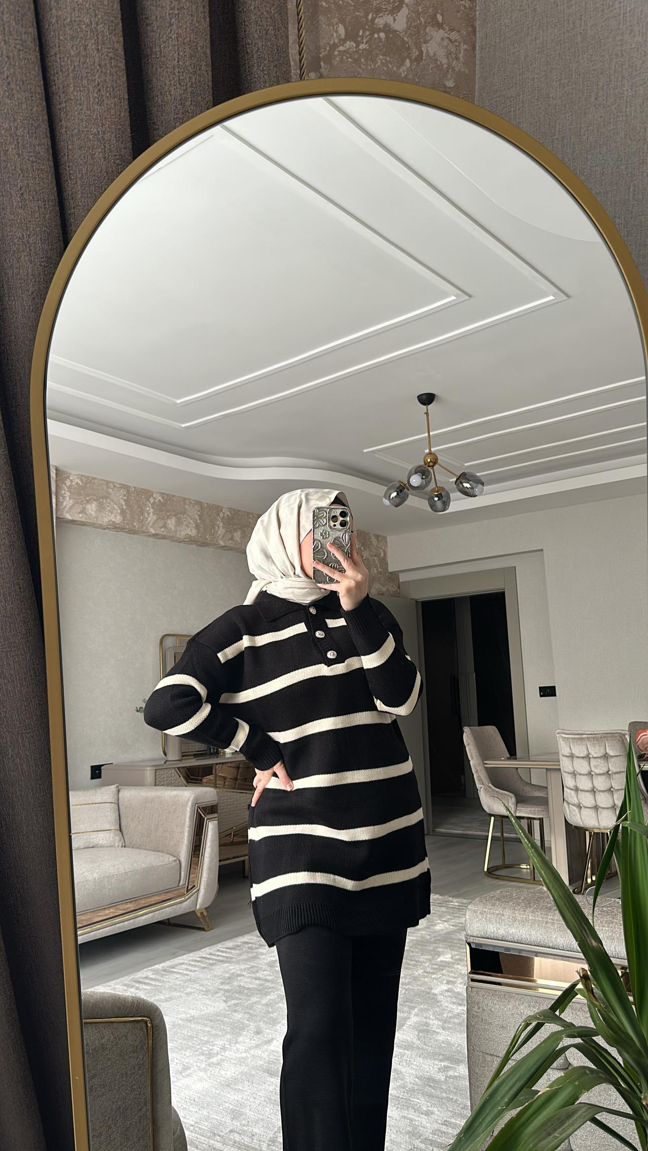 Düğmeli Çizgili Triko Takım